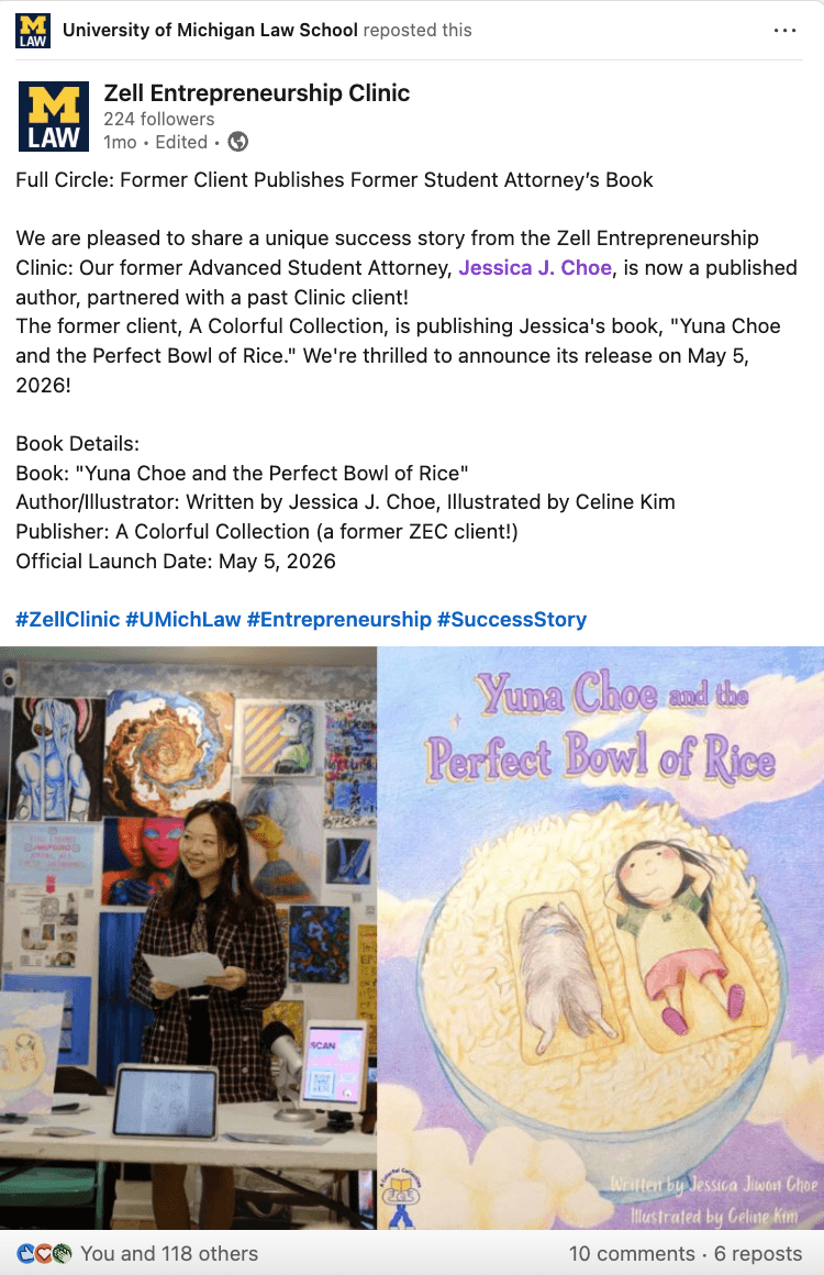 As the story of "Yuna Choe and the Perfect Bowl of Rice" has such strong ties to the University of Michigan Law School, the Zell Entrepreneurial Clinic published a feature on the project - detailing the incredible story of their former clinic client "The Colorful Collection" publishing former advanced student attorney for the clinic - author Jessica Jiwon Choe's picture book.