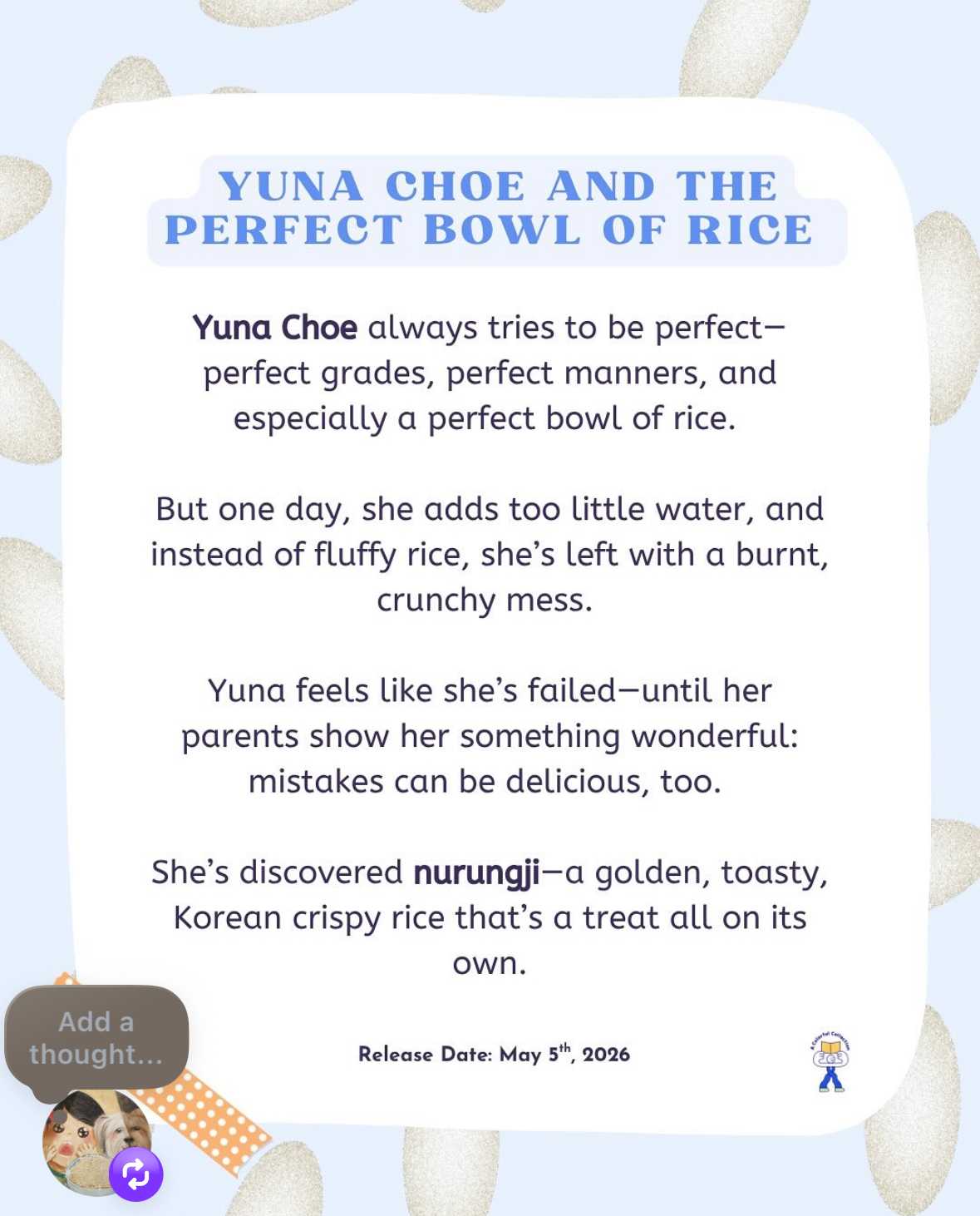 ”Yuna Choe and the Perfect Bowl of Rice” is a Korean American picture book, written by Jessica Jiwon Choe, illustrated by Celine Kim, to be published by “A Colorful Collection” May 5, 2026.